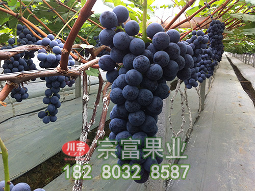 【品種特征】自然條件下,果穗圓錐形,果穗大,平均穗重400克,果粒平均重3.5克。經膨大劑處理後,平均穗重670克,果粒著生緊密,近圓形,平均粒重9.35克,大粒重可達12克以上。果皮紫黑色,果實容易著色且上色一致,成熟一致;果粉厚,果肉硬脆,味濃甜,有較濃的草莓香味,口感佳,品質優良。可大力發展。