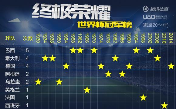 德國第4次奪冠追平意大利:在決賽中戰勝阿根廷,德國隊第4次奪得世界杯冠軍,追平了意大利,巴西以5次奪冠繼續領跑。德國隊第8次殺入世界杯決賽,4次奪冠4次亞軍。為了這個世界杯冠軍,德國人已經等待了24年,他們上一次在世界杯上奪冠還要追溯到1990年。
