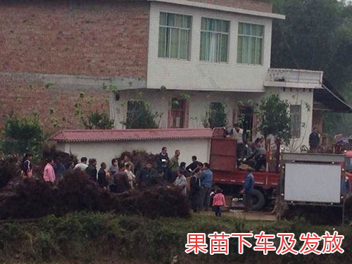 四川省雅安市寶興在對我單位充分考查、核實、論證後定購圓黃梨樹苗50000株,圖片為:我單位人員在下車及發放果苗