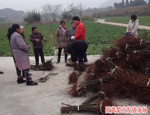 四川省金堂縣土橋鎮對我單位充分考查、核實、論證後定購23600株圓黃梨苗。此圖:圓黃梨苗下車及發放現場