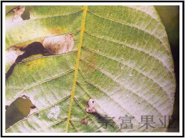核桃苗圃灰斑病,主要為害葉片。病斑呈圓形,大小3~8(mm),發病初期呈淺綠色,後期變成褐色,後變為灰白色,後期病斑上生出黑色小粒點,即病原菌分生孢子器。病情嚴重時,造成早期落葉。河北、陝西均有發生。