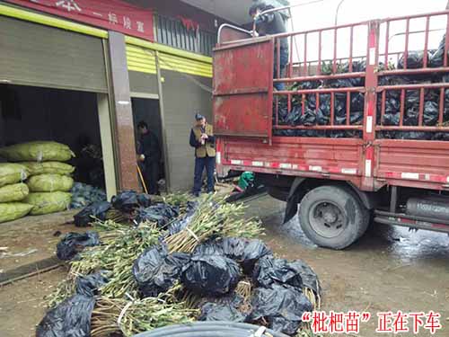 雲南省昭通市鎮雄縣芒部鎮在對我單位充分考查、核實、論證後定購枇杷苗16000株,圖片為:我單位人員在下車及發放果苗