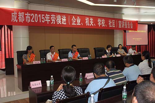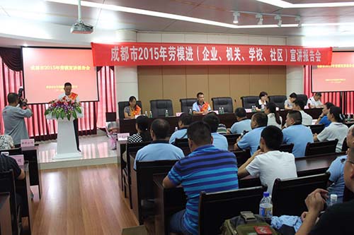 在溫江區”成都市農業職業技術學校“舉行”成都市2015年勞動模範宣講報告會“,成都天府新區宗富水果種植專業合作社理事長——裴忠富先發表重要講話。
