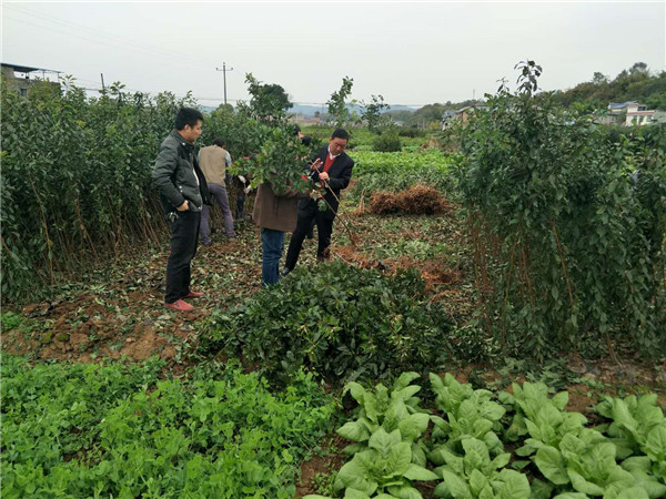 裴忠富指著李樹苗講解到:李樹苗一般砧木接口直徑 為2—3厘米的接一個接穗,直徑3—5厘米的接2個接穗,6—8厘米以上的接3-6個接穗。接穗插好後,用包裝繩或塑料筋綁緊,隨後用濕報紙(與砧 木粗細相當)蓋住斷麵,再用報紙包裹成筒裝,上麵高出接穗2厘米,裝上濕潤土(土壤含水量15%),後用新塑料袋套住紙筒紮緊。