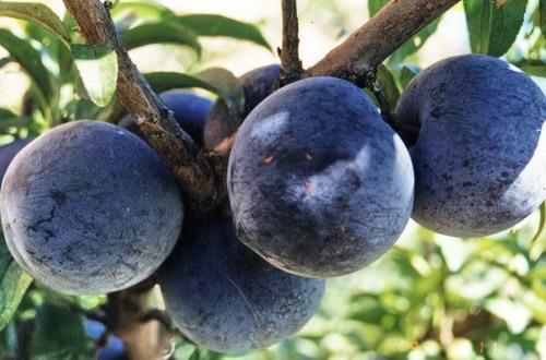 果實性狀:果實大型,平均單果重96克,大單果重152克。果實扁圓形,果頂平,縫合線淺而不明顯。果麵紫黑色,光亮美觀。果皮較厚,果粉少,果點小。果肉淡黃色,近核處果肉微紅色,質細,不溶質,汁液多,味甜,富香氣。離核,核小。含可溶性固形物14%~15%,總糖13.1%,可滴定酸0.7%。果實耐貯藏,品質極佳。果實9月下旬成熟。